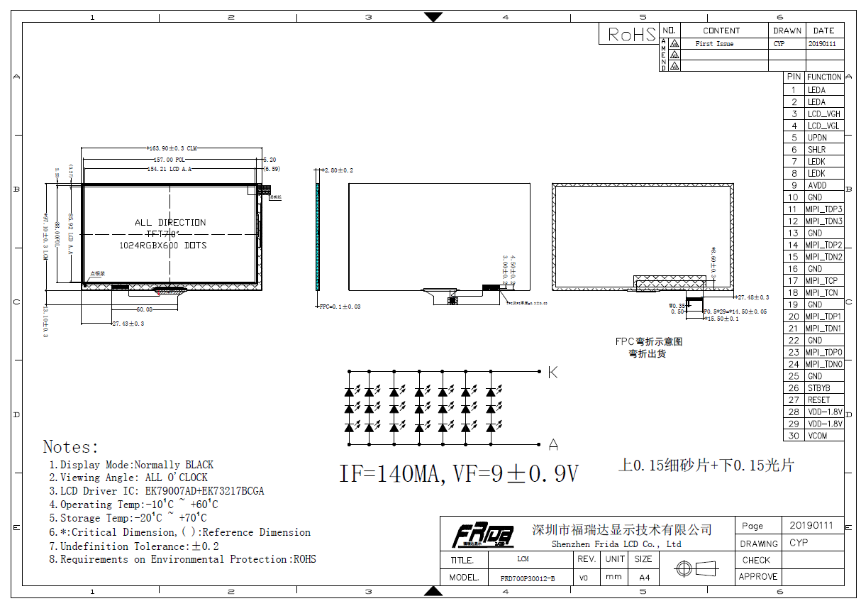 接 口:MIPI 30PIN/50PIN RGB40PIN LVDS