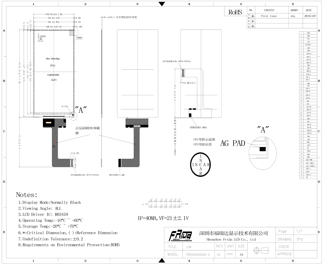 5.5寸TFT液晶屏總成 IPS全視角 產(chǎn)品聲明:以上產(chǎn)品為我司標(biāo)準(zhǔn)產(chǎn)品,可根據(jù)客戶(hù)要求進(jìn)行產(chǎn)品定制; 網(wǎng)站上所列產(chǎn)品之外觀、顏色、參數(shù)僅供用戶(hù)參考,以福瑞達(dá)顯示公司生產(chǎn)實(shí)物為準(zhǔn),客戶(hù)朋友們?nèi)鐚?duì)產(chǎn)品有任何疑問(wèn)請(qǐng)盡快與我們?nèi)〉寐?lián)系,我們將竭誠(chéng)為您服務(wù),謝謝! 產(chǎn)品應(yīng)用:5.5寸TFT液晶屏IPS全視角產(chǎn)品可帶電阻和電容觸摸總成出貨,主要應(yīng)用于行車(chē)記錄儀、三防手機(jī)、溫控器等涵蓋車(chē)載、工控、智能家具、消費(fèi)類(lèi)電子等多個(gè)行業(yè),讓尋常生活更智能。 產(chǎn)品型號(hào):FRD550A50004 -A 分辨率:1440*2560 產(chǎn)品尺