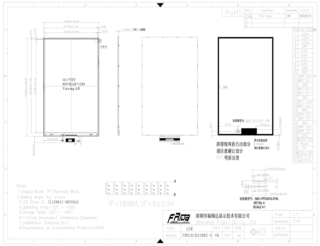 10.1寸TFT液晶顯示屏(800*1280) ,產(chǎn)品型號:FRD101B31002-A