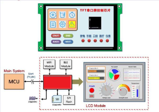 | 特性 | 其內(nèi)部采用32bit M4核心架構(gòu),主要的功能就是提供Uart串口通訊,讓主控端MCU透過簡易的指令就能輕易的將要顯示到TFT屏的內(nèi)容傳遞給小尺寸MCU屏上的TFT驅(qū)動器(Driver) |