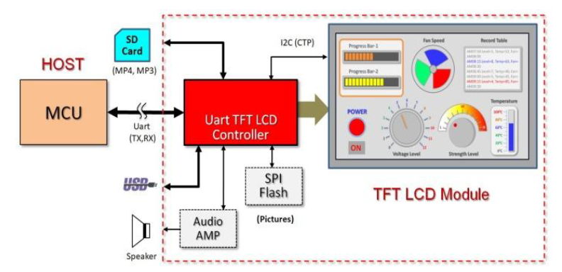 | 特性 | 基于ARM 9 CPU架構(gòu),集成了規(guī)頻解碼、音頻解碼器、TFT LCD控刢器及串口屏通訊協(xié)議。主要癿功能就是提供Uart串口通訊,讓外部主控MCU透過簡(jiǎn)易的指令就能輕易的將要顯示的內(nèi)容呈現(xiàn)在TFT屏上,內(nèi)部MCU程序不硬件加速能讀取SD卡顯示數(shù)據(jù),降低主控MCU處理圖形顯示的時(shí)間。 |